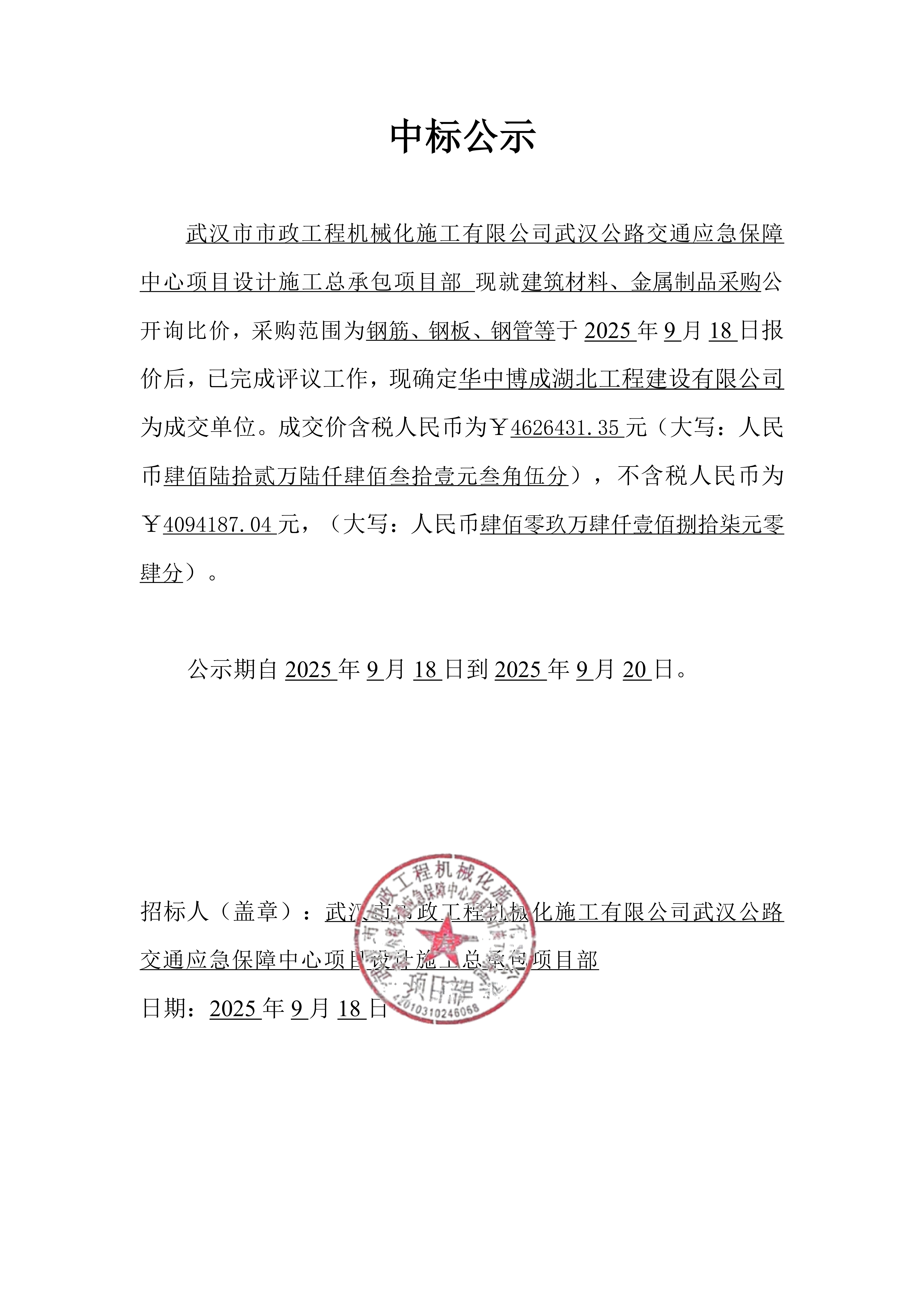 武汉公路交通应急保障中心项目设计施工总承包建筑材料、金属制品采购中标公示