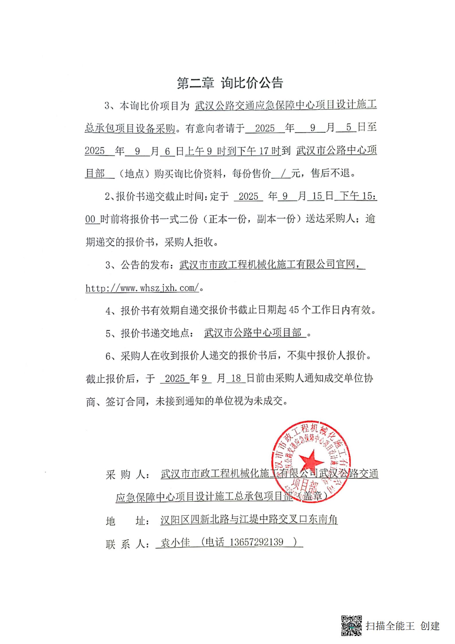 武汉公路交通应急保障中心项目设计施工总承包项目设备采购询价公告
