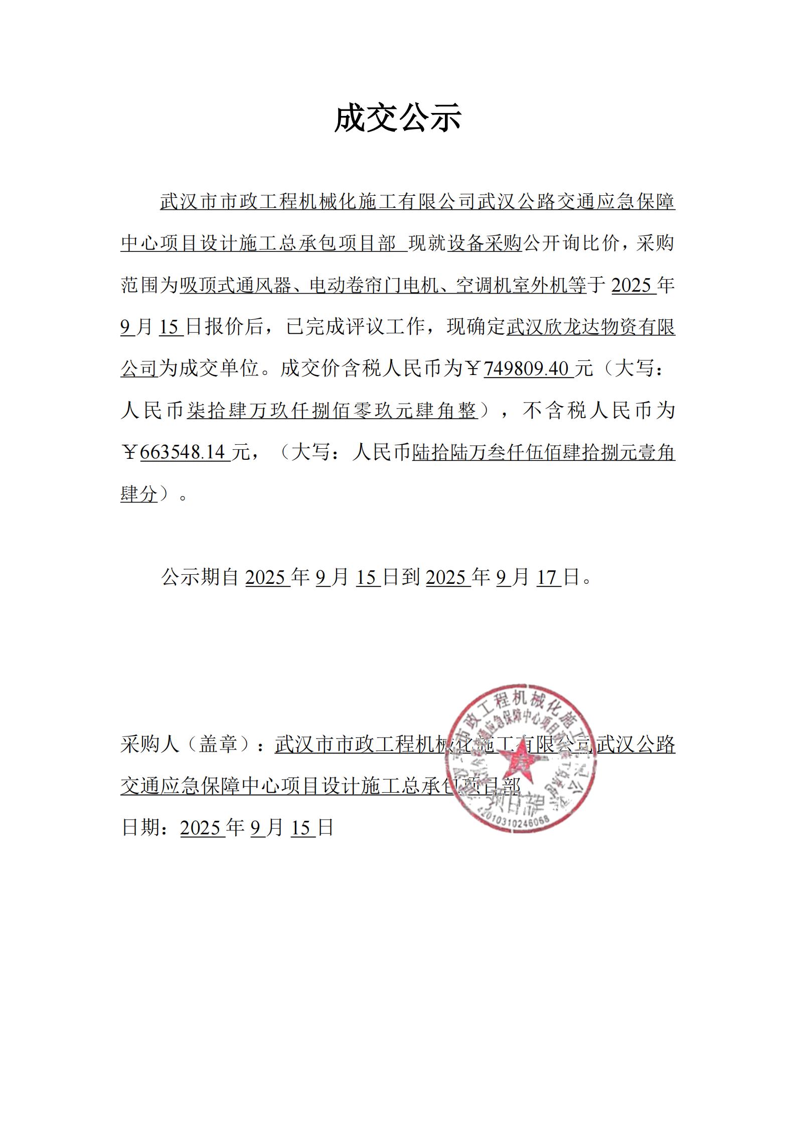 武汉公路交通应急保障中心项目设计施工总承包项目设备采购成交公示