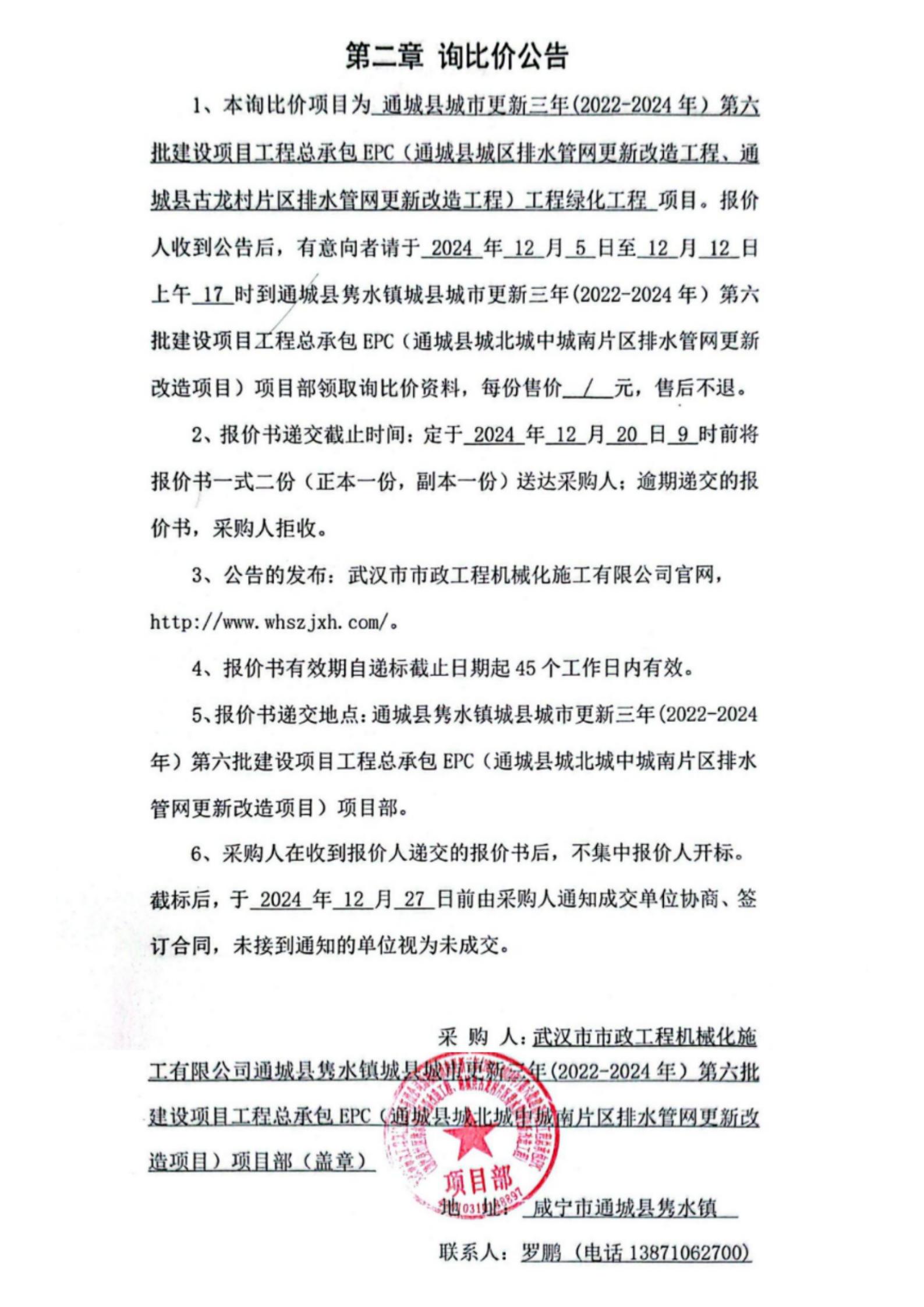 通城县城市更新三年(2022-2024年)第六批建设项目工程总承包EPC(通城县城区排水管网更新改造工程、通城县古龙村片区排水管网更新改造工程)工程绿化工程询价公告