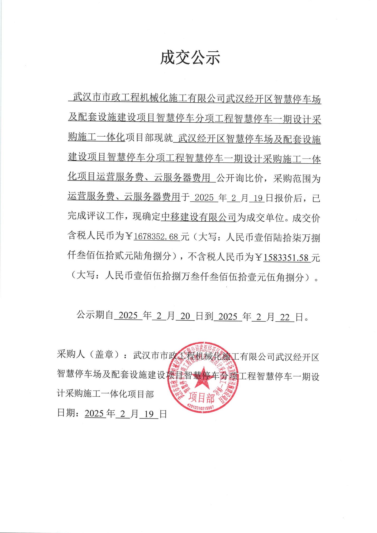 武汉经开区智慧停车场及配套设施建设项目智慧停车分项工程智慧停车一期设计采购施工一体化项目运营服务费、云服务器费用成交公示