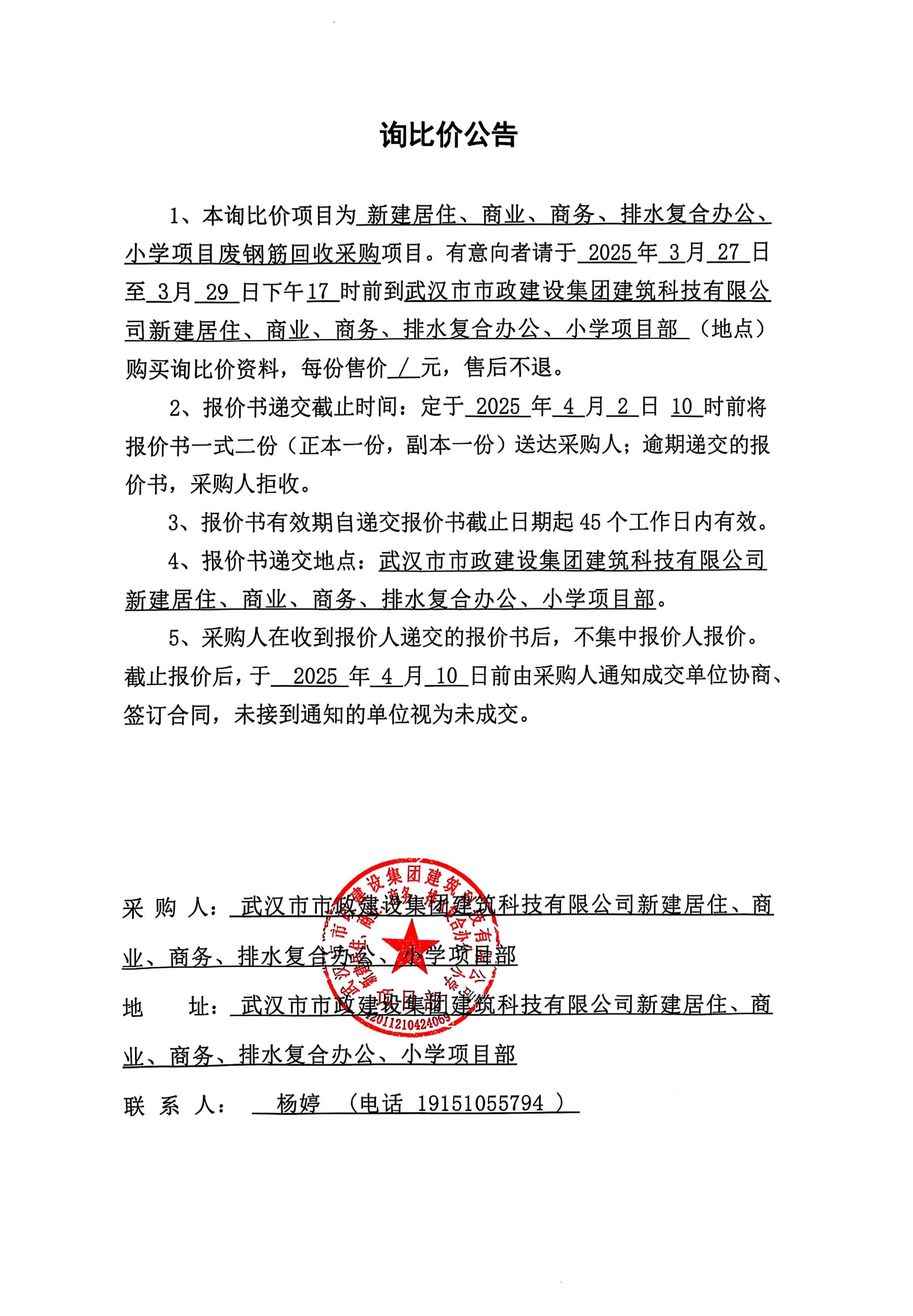 武汉市市政建设集团建筑科技有限公司新建居住、商业、商务、排水复合办公、小学项目废钢筋回收采购询价公告