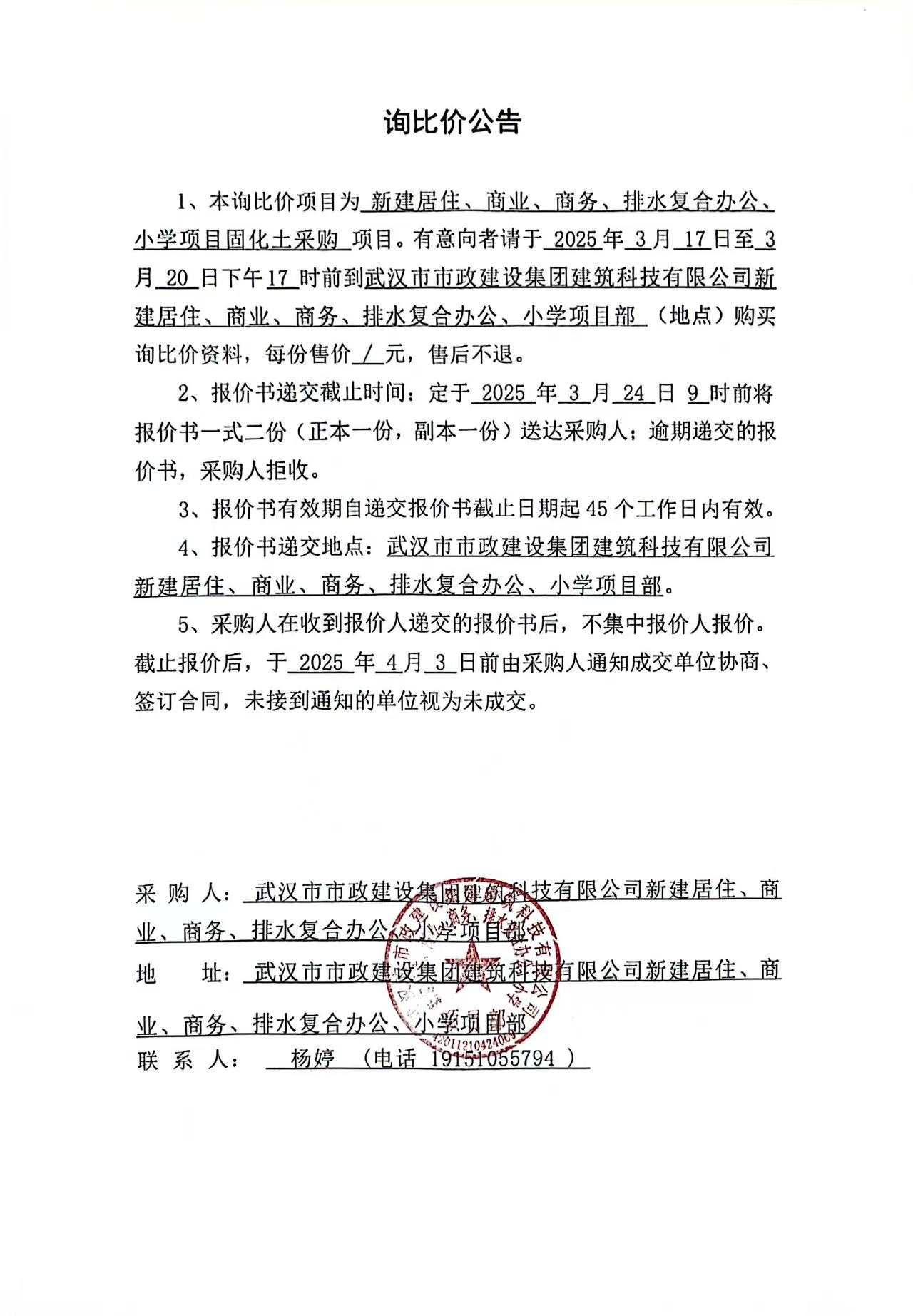武汉市市政建设集团建筑科技有限公司新建居住、商业、商务、排水复合办公、小学项目固化土采购询价公告