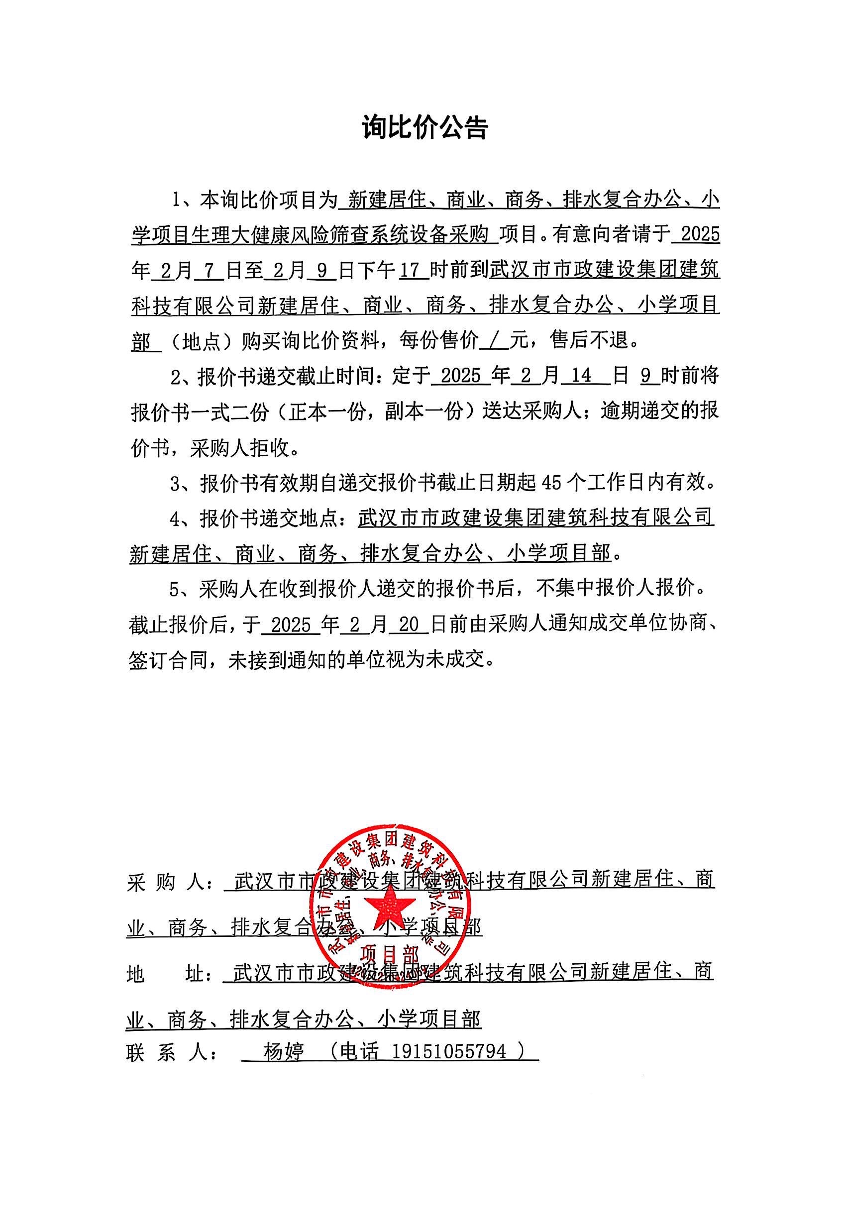 武汉市市政建设集团建筑科技有限公司新建居住、商业、商务、排水复合办公、小学项目生理大健康风险筛查系统设备采购询价公告