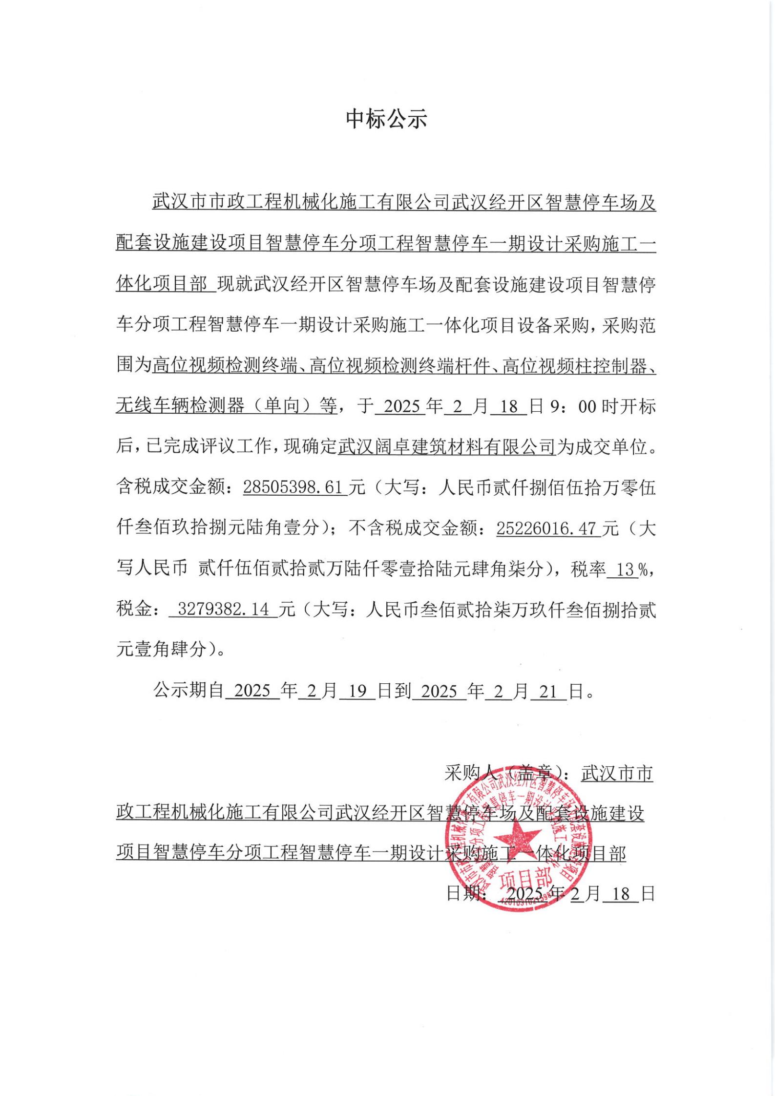 武汉经开区智慧停车场及配套设施建设项目智慧停车分项工程智慧停车一期设计采购施工一体化项目 设备采购成交公示