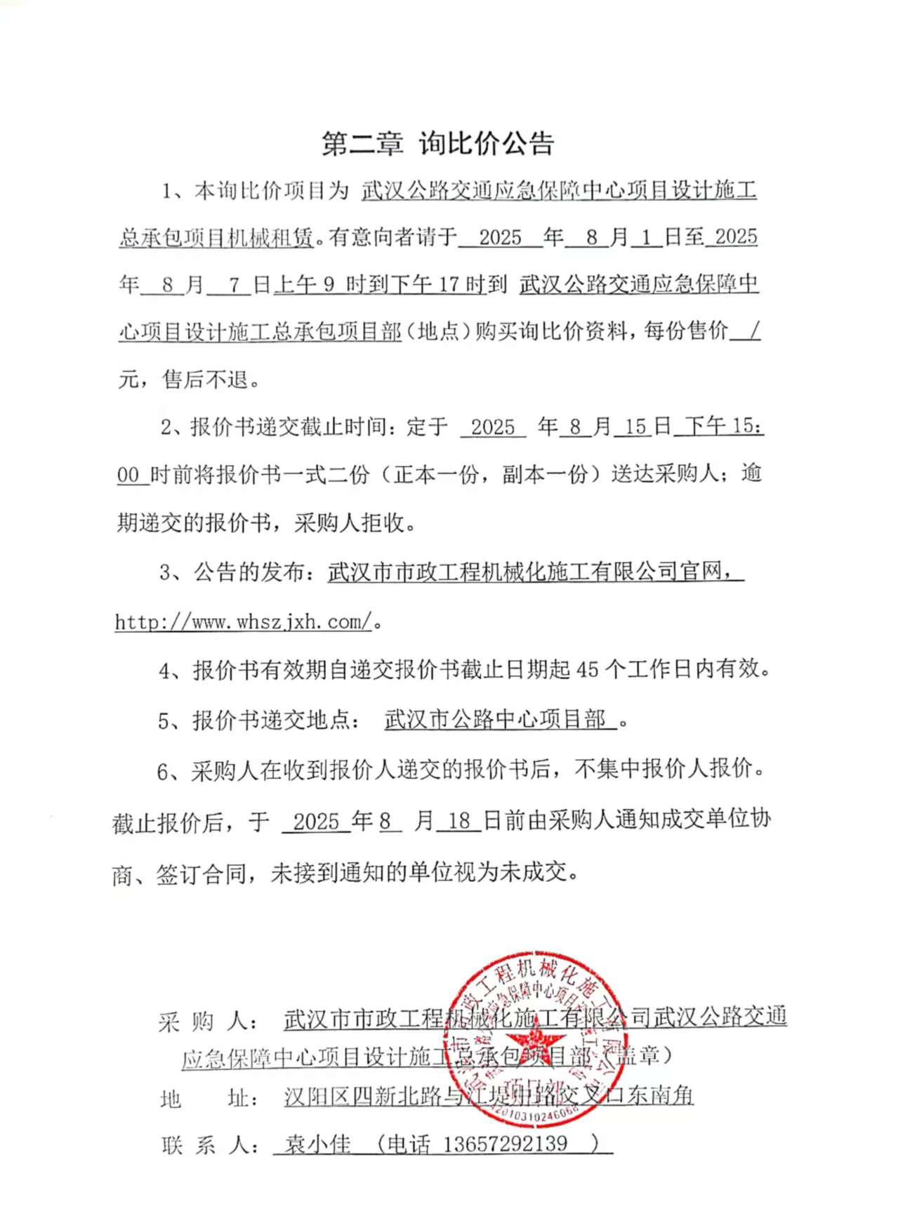 武汉公路交通应急保障中心项目设计施工总承包项目机械租赁询价公告