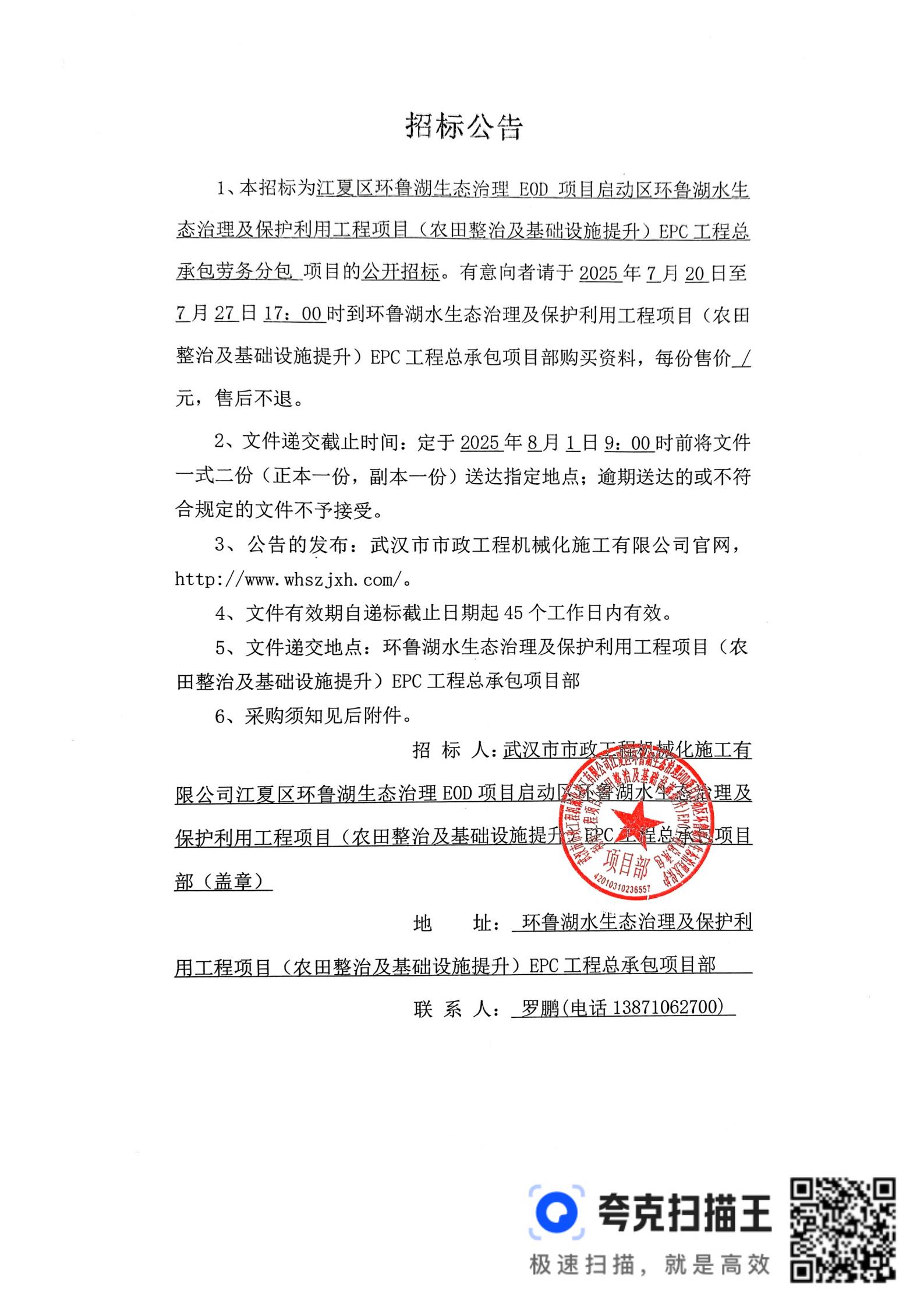 江夏区环鲁湖生态治理 E0D 项目启动区环鲁湖水生态治理及保护利用工程项目(农田整治及基础设施提升)EPC工程总承包劳务分包招标公告